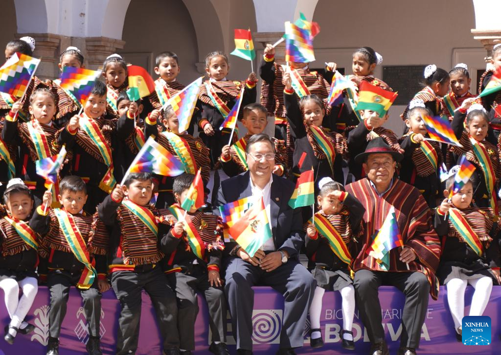 El presidente de Bolivia, Luis Arce, y el vicepresidente, David Choquehuanca, participan en el inicio de los actos conmemorativos por el Bicentenario de la Independencia, en la Plaza 25 de Mayo, en la ciudad de Sucre (Fuente Fotográfica. Xin Hua)